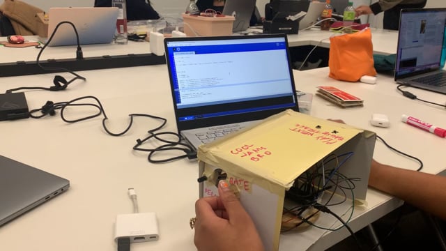 Visually, the potentiometer that changes the rate alters the hue values of the image, and the potentiometer that changes the delay alters the saturation values of the image. The button that is in control of play/pause changes the quantitative values of the inner image as well as the rotation of the image.